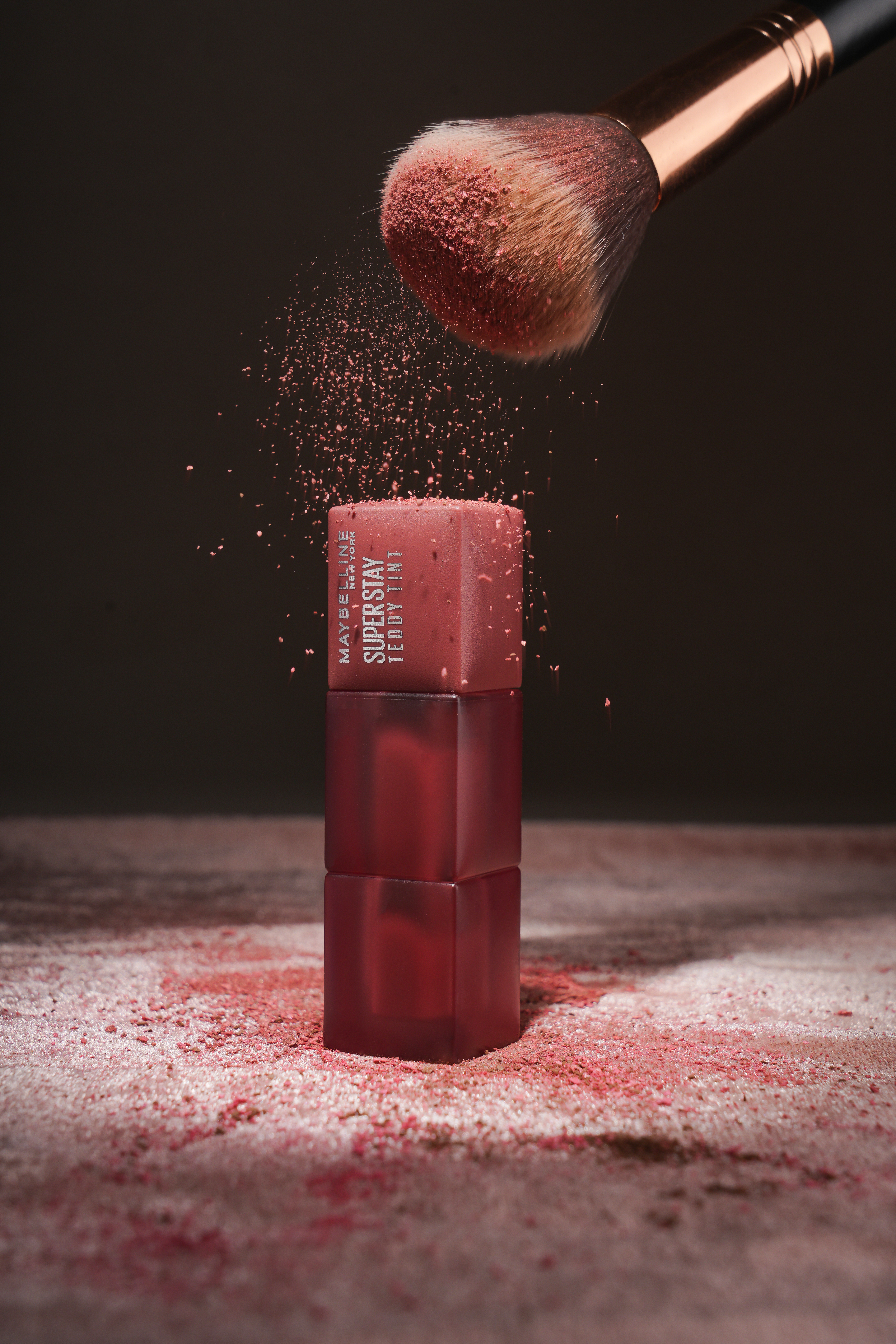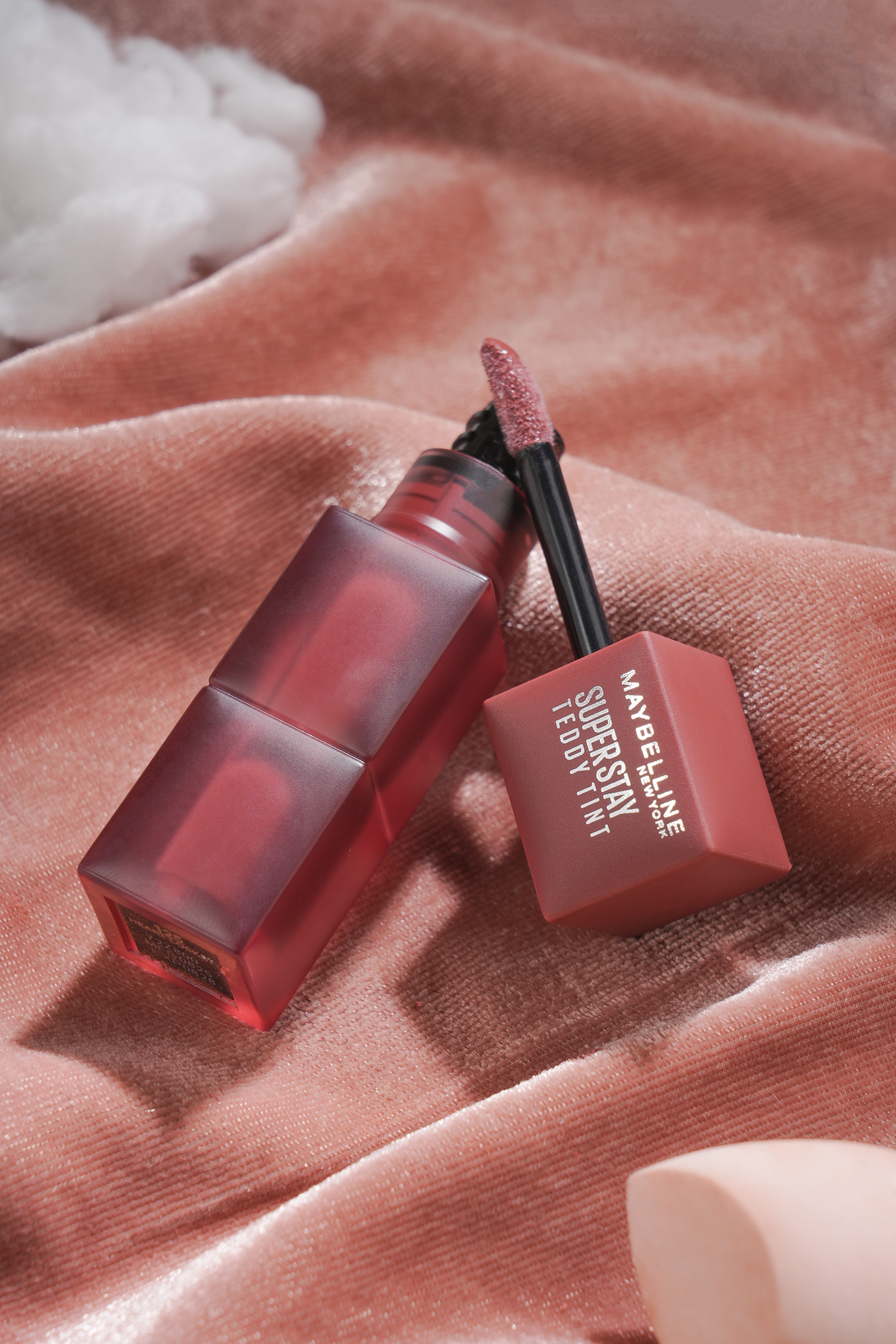 The styling responds to the soft, blurred finish of the Teddy Tint formula. Velvet fabric and tonal surfaces create a plush base, while falling pigment, a makeup brush, and cloud-like cotton details suggest lightness and blendability.