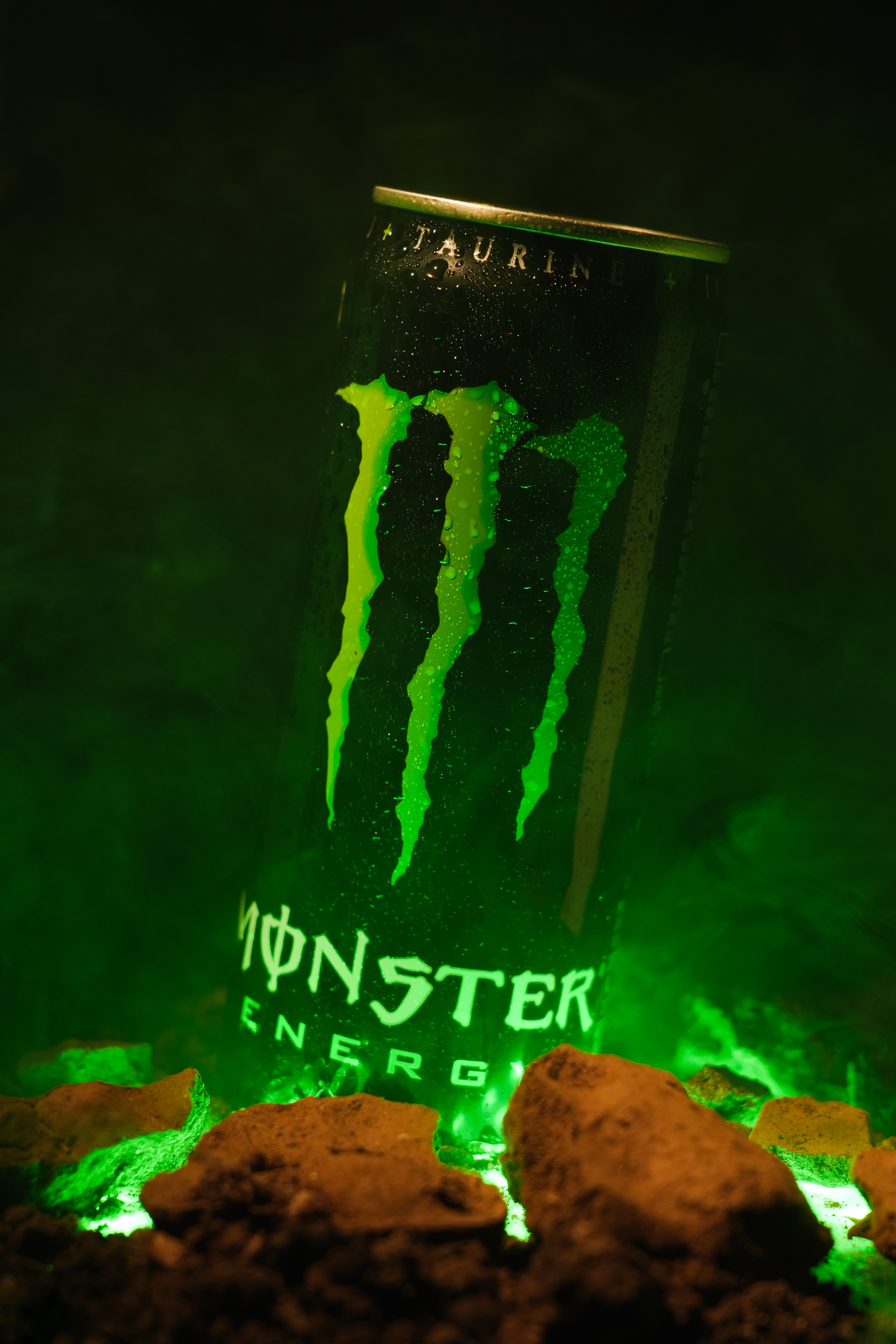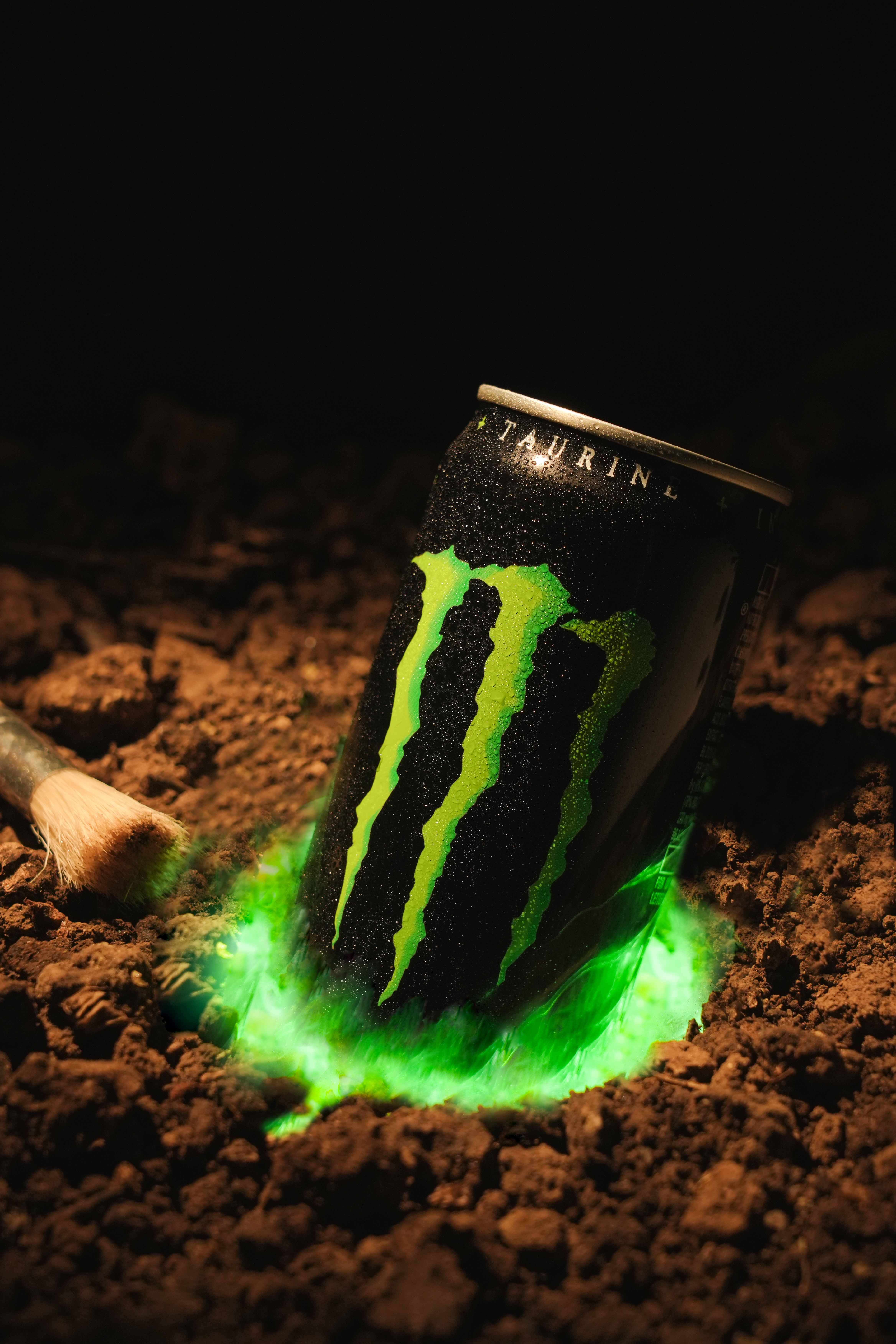The styling draws from the idea of Monster as something emerging from the ground with force. Soil textures and green backlight were used to create a darker, high-energy environment, moving from buried details and fractured surfaces to the final emergence of the can.